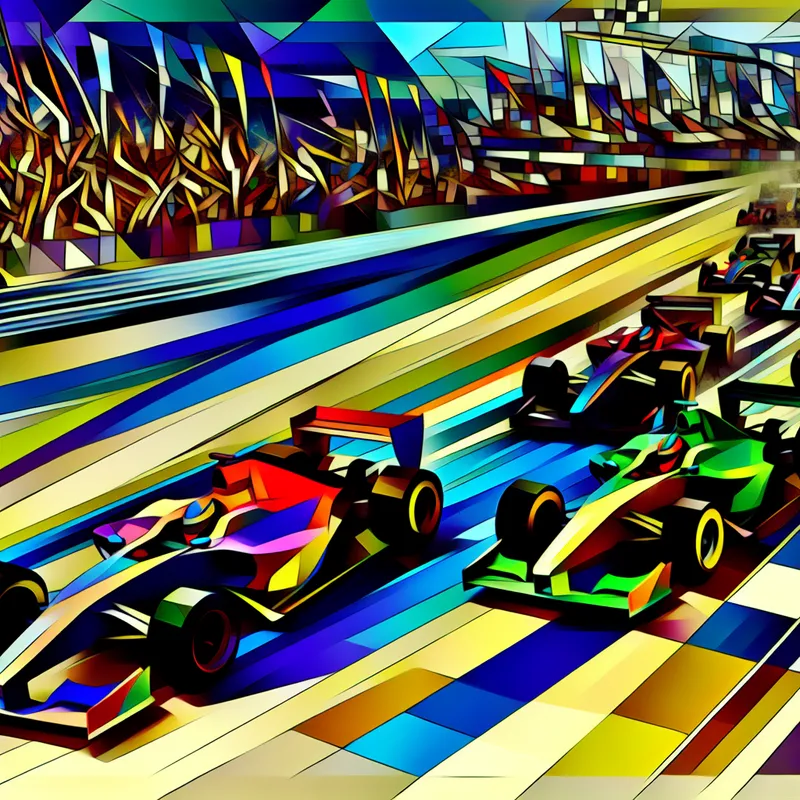 Geometrische en surrealistische afbeelding van een auto race met illusies van snelheid en perspectief.