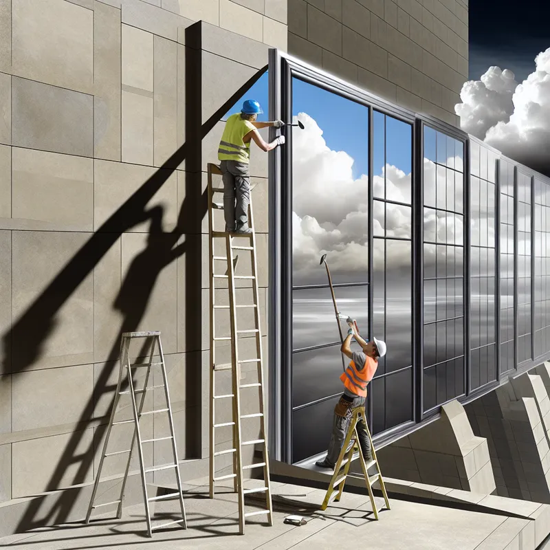 Twee arbeiders op een ladder installeren moderne energiezuinige ramen in een monumentaal gebouw.