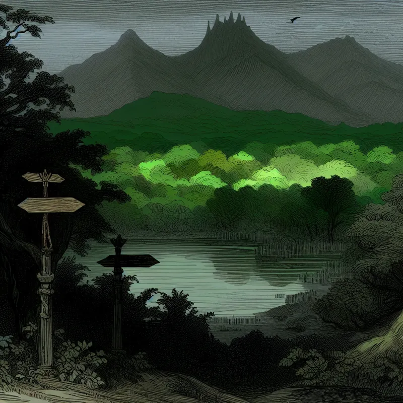 Een betoverend natuurlijk landschap met donkere bossen, een kronkelige rivier, en mistige bergen op de achtergrond.