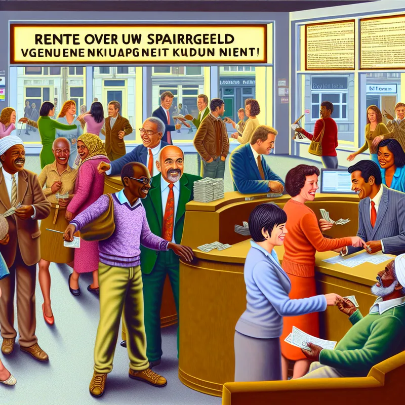 Een drukke banksetting met een blije oude man in gesprek met een vriendelijke bankier, omringd door andere klanten die zich bezighouden met geld tellen en praten.