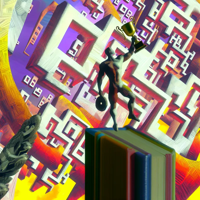 Artistieke weergave van een beroemde atleet die triomfantelijk op een voetstuk staat in een surrealistisch landschap vol geometrische vormen.