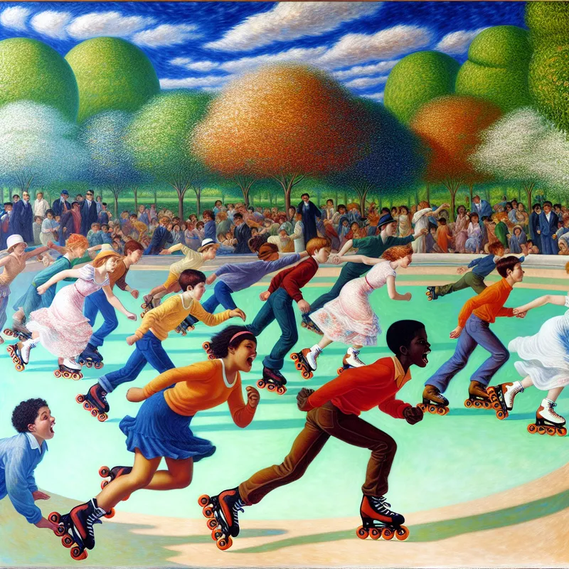 Een kleurrijk buiten evenement met rolschaatsers in levendige kostuums die dynamische bewegingen uitvoeren en in een competitieve houding staan, onder een blauwe lucht met dikke penseelstreken.
