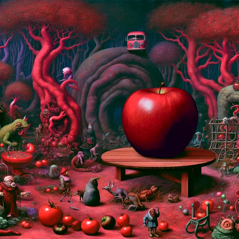 Surrealistisch landschap met bizarre wezens en een grote glanzende rode appel op een houten tafel