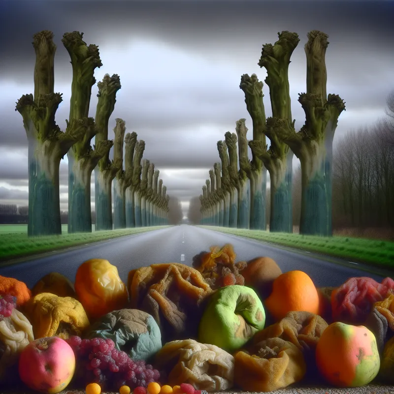 Een hyper-realistisch landschap met verrotte vruchten op de grond, omringd door een verlaten weg en dramatische bomen onder een sombere lucht.