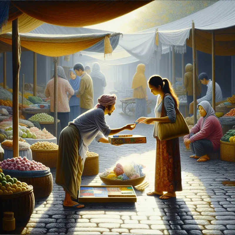 Twee vrienden ruilen een kleurrijk boek voor een levendig bordspel op een serene markt