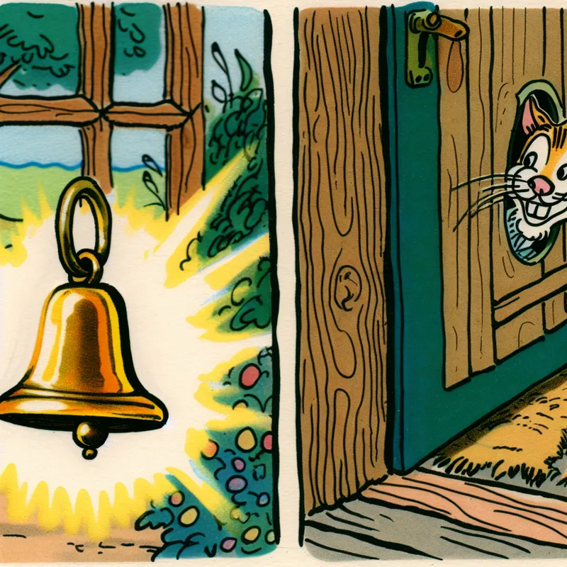 Een vrolijke cartoon van een schelling die aan een houten deur hangt, met een nieuwsgierige kat die erdoorheen kijkt en een blije postbode in de buurt.