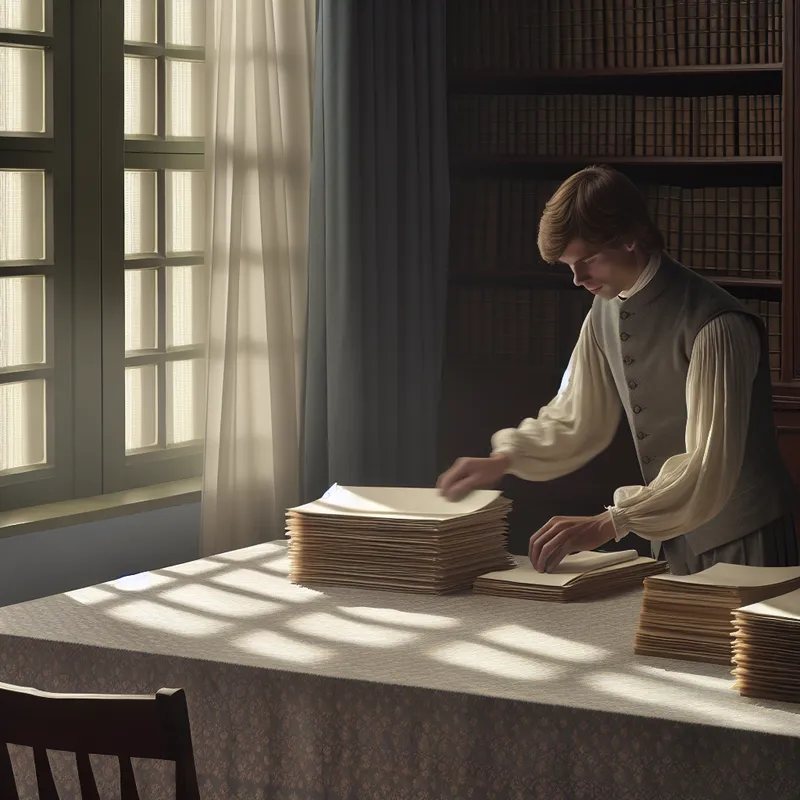 Een jonge man organiseert zorgvuldig een stapel documenten op een gepolijste houten bureau in een rustige interieursetting.