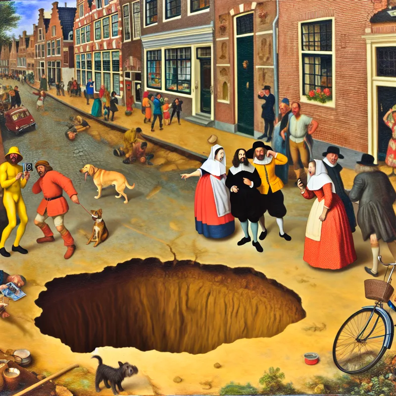 Een drukke straat met een grote sinkhole, omringd door nieuwsgierige mensen en een verwonderde hond.