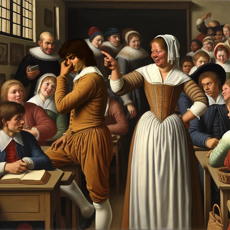 Lively Dutch classroom with a young man flattering a stern teacher while other students engage in various activities