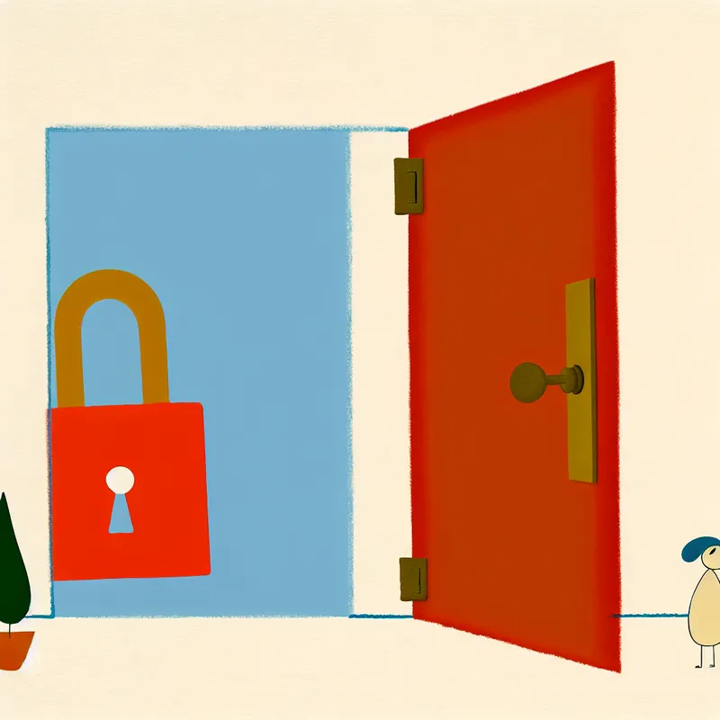 Een minimalistische illustratie van een kleurrijke deur met een groot slot, met een schattig personage dat nieuwsgierig naar het slot kijkt.