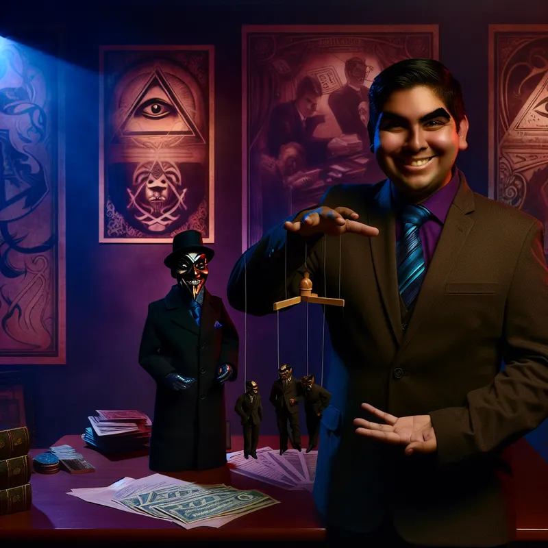 Een slimme zakenman met een mysterieuze glimlach bedient een marionet die zijn concurrenten voorstelt, omringd door contracten en geld in een duistere kantoorsetting.