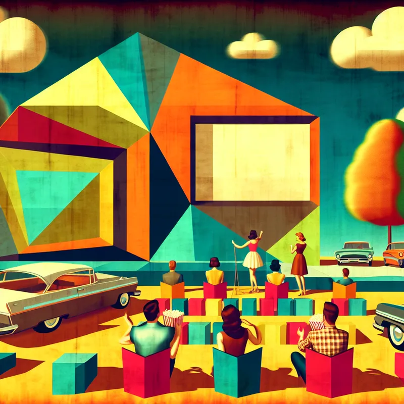 Een retro-futuristische afbeelding van een weekend scene met een buitenbioscoop, mensen met popcorn en kleurrijke stoelen.