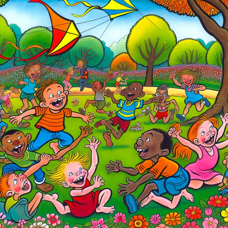 Vrolijke kinderen spelen in een zonnig park met kleurrijke bloemen en een helderblauwe lucht.