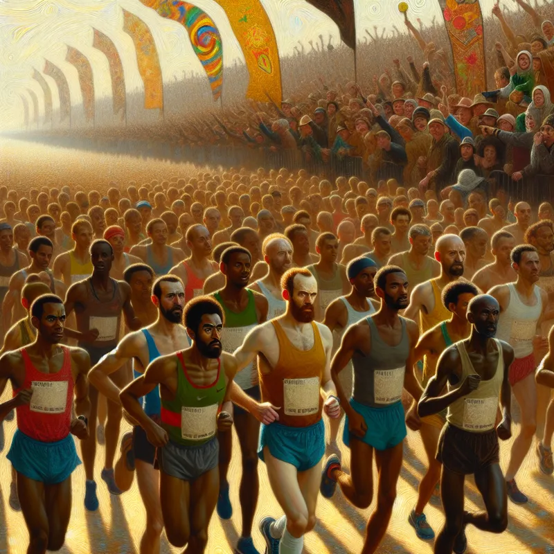 Start van een marathon met enthousiaste hardlopers en juichende toeschouwers bij zonsopgang.