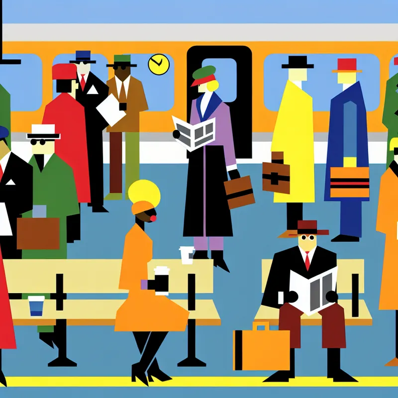 Een minimalistische scène van een druk treinstation in de stijl van Dick Bruna, met forenzen in felgekleurde kleding