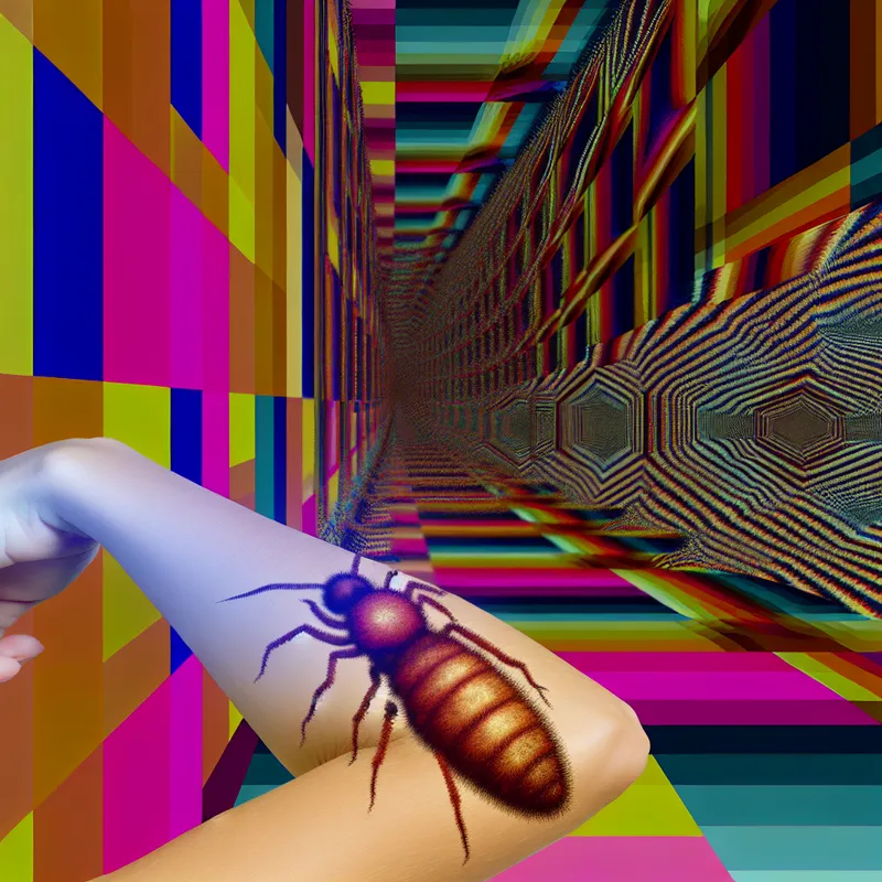Surrealistische afbeelding van een insectensteek op de arm en Escher-achtergrond
