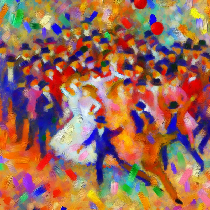 Abstract expressionist schilderij van een vrolijke groep vrienden die samen komen tijdens een feestelijke viering.