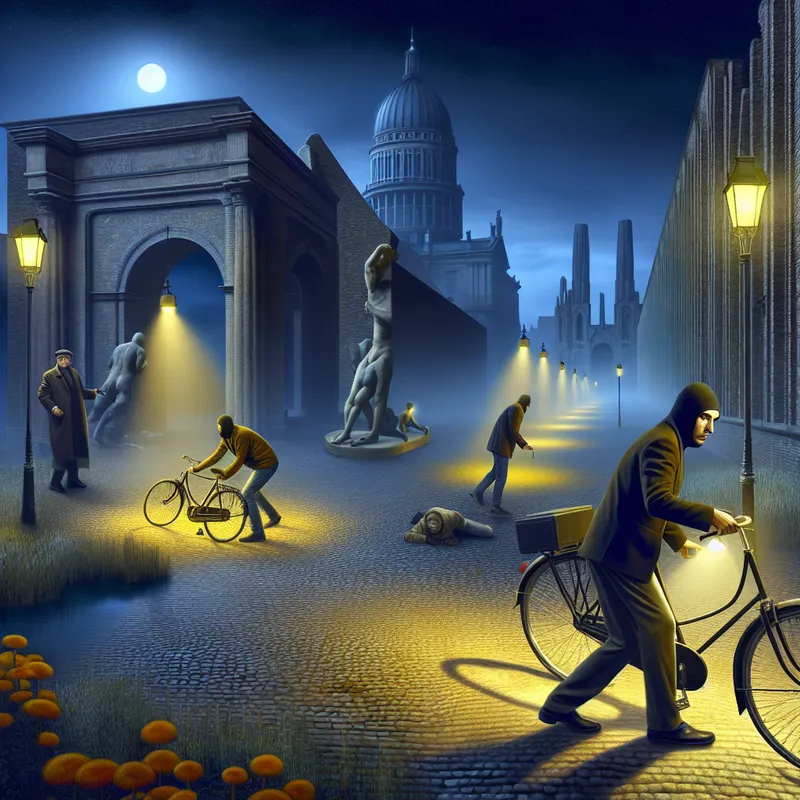 Een groep dieven steelt een fiets in een goed verlichte stedelijke straat 's nachts, met nadruk op één dief die de fiets naar een donkere steeg trekt.
