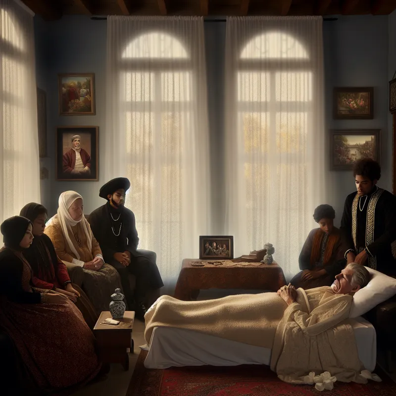 Elderly man lying peacefully in bed surrounded by family members in a cozy living room during a mourning moment.