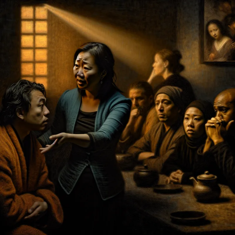 Een vrouw biedt emotionele steun aan collega's in een sfeervol verlichte kantooromgeving, met uitdrukkingen van zorg en empathie in een dramatische schaduwsetting.