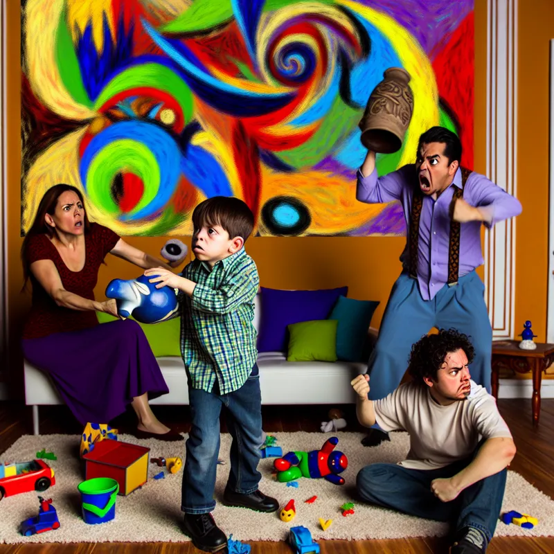 Een jongen knockt een vaas om in een kleurrijke woonkamer vol speelgoed, terwijl zijn bezorgde ouders kijken, uitdrukking van bezorgdheid en frustratie op hun gezichten.