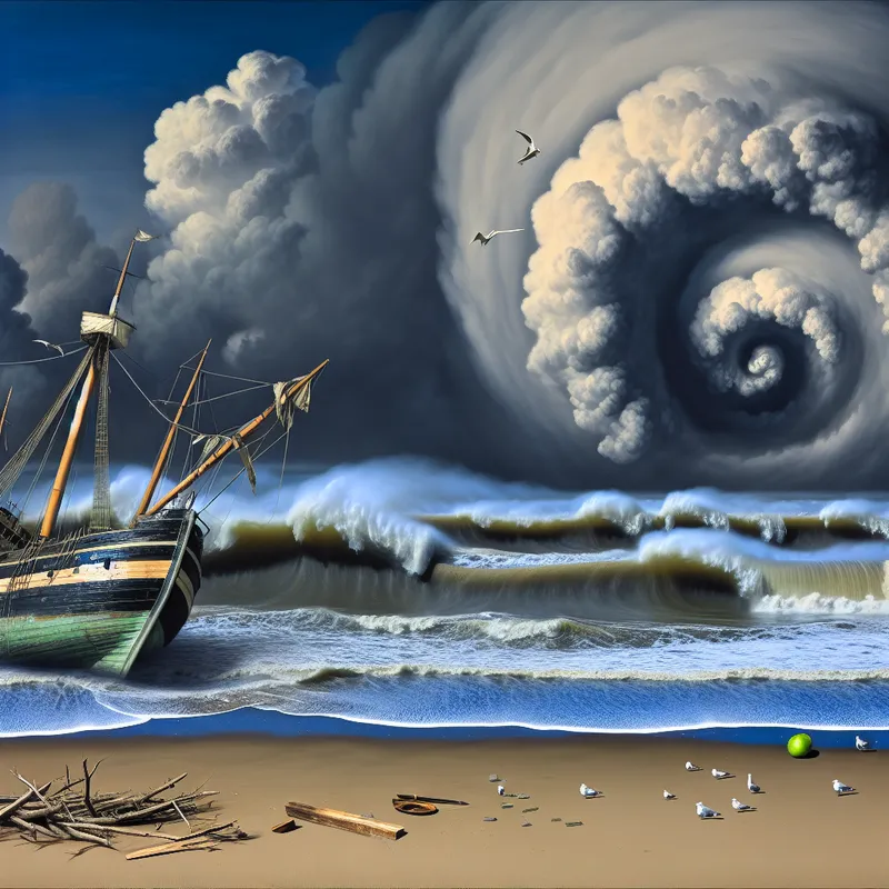 Een grote schip dat vastzit op een zandstrand, met woeste golven op de achtergrond