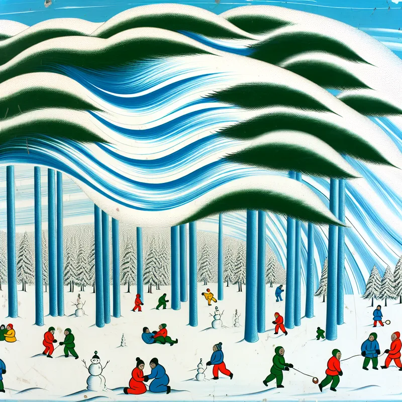 Winterlandschap met sneeuwbedekte bomen en mensen die spelen in de sneeuw.
