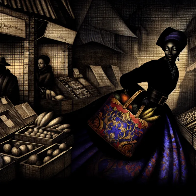 Een stijlvolle vrouw met een gedetailleerde tas vol kleurrijke boodschappen, wandelend door een mysterieuze markt.