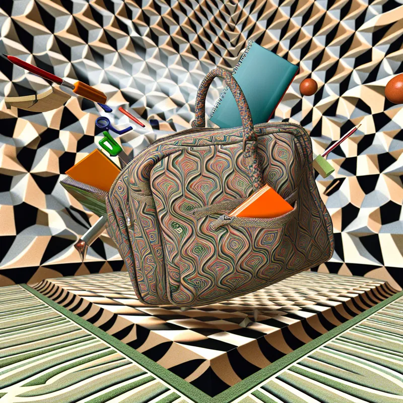 Een surrealistisch beeld van een open tas die in de lucht zweeft, omringd door schoolspullen zoals boeken en een laptop, op een geometrische tegelvloer.