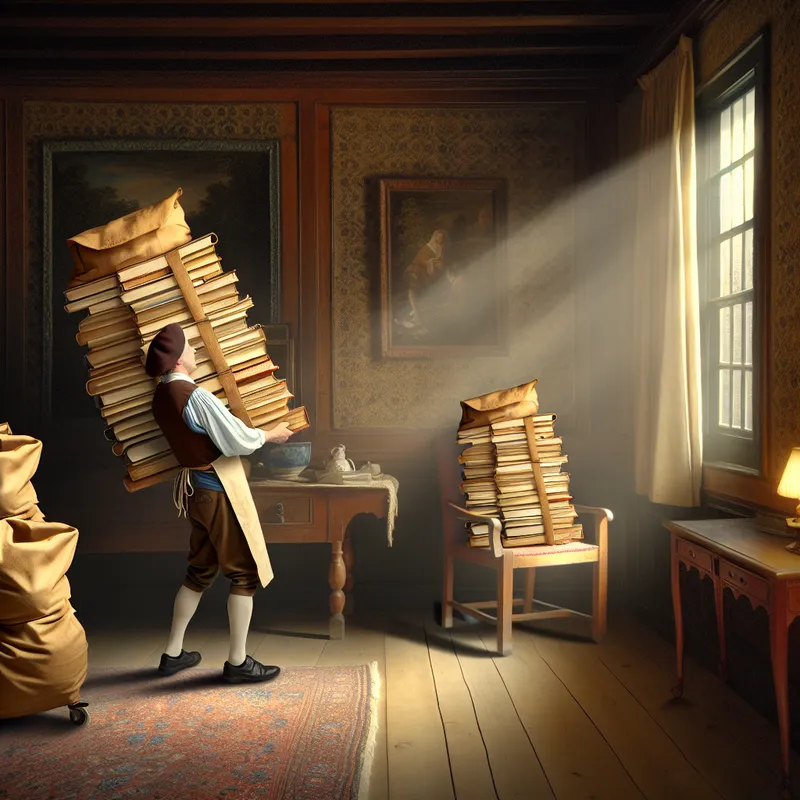 Medewerker draagt tassen met boeken in sfeervolle kamer