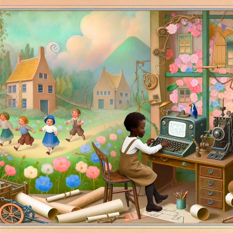 Een ingenieur test software op een vintage computer in een sprookjesachtige omgeving, omringd door kleurrijke bloemen.
