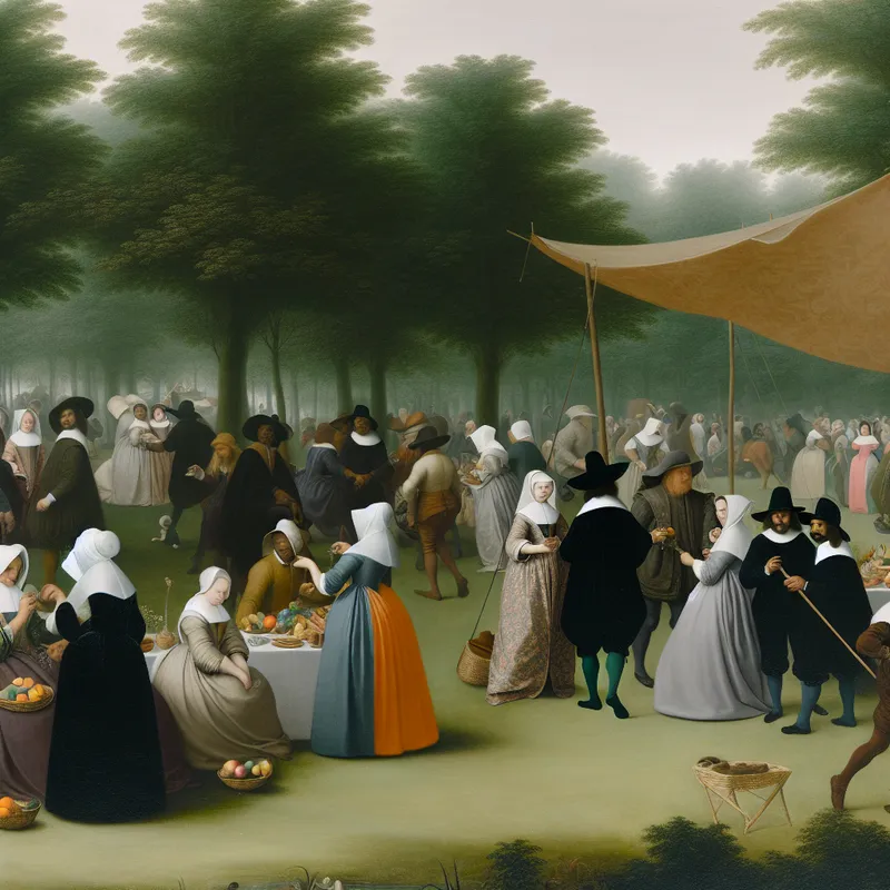 Buitenscène van een elegant festival in een park met historische kleding, mensen onder tenten en voedselkramen.