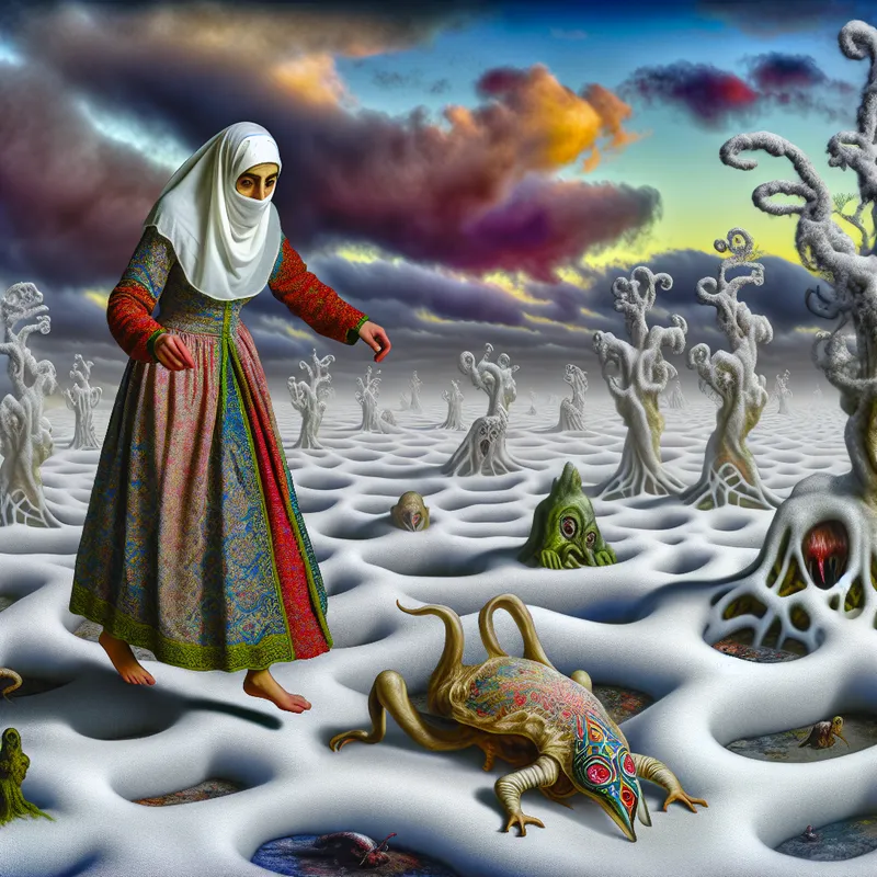Een persoon stapt voorzichtig op een uitgestrekt, besneeuwd oppervlak, omringd door surrealistische elementen in de stijl van Hieronymus Bosch.