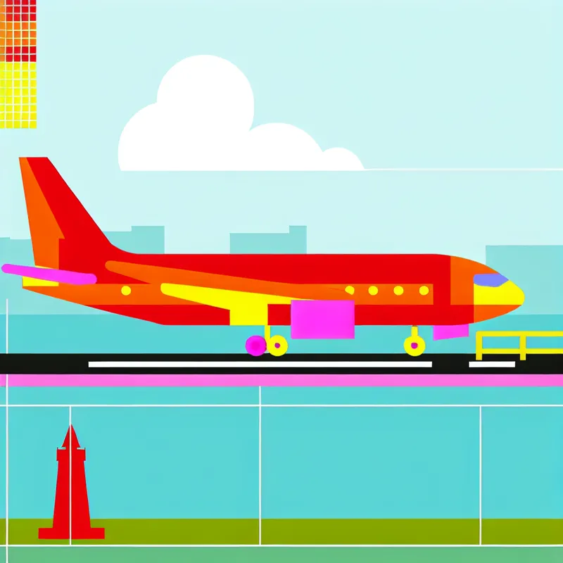 Minimalistische illustratie van een kleurrijk vliegtuig op de startbaan van een luchthaven met een helderblauwe lucht en een herkenbaar Londens landmark op de voorgrond.