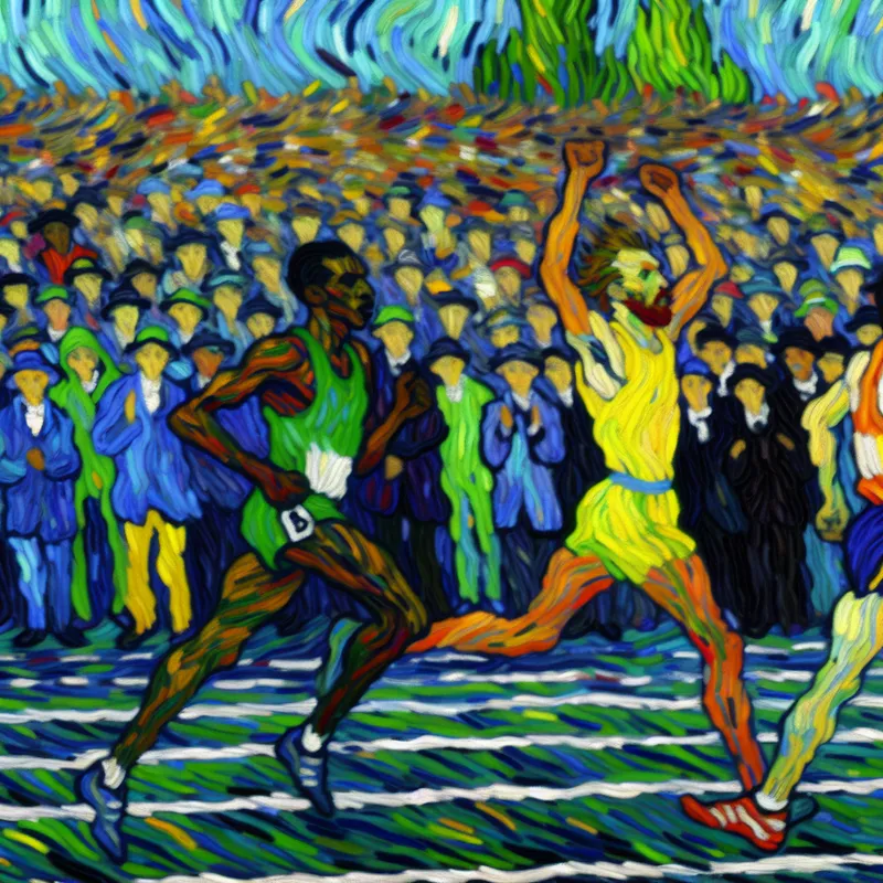Aan de finishlijn van een hardloopwedstrijd in de stijl van Vincent van Gogh, met kleurrijke, draaiende penseelstreken.