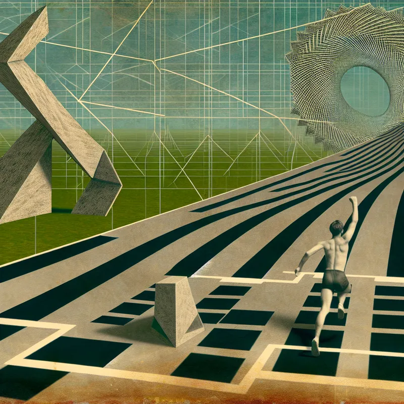 Een surrealistische afbeelding in Escher-stijl van een hardloper die als tweede de finishlijn overschrijdt op een Mobius-racetrack.