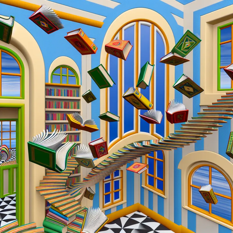 Surrealistische bibliotheek met boeken die uit de ramen vliegen, geïnspireerd door M.C. Escher