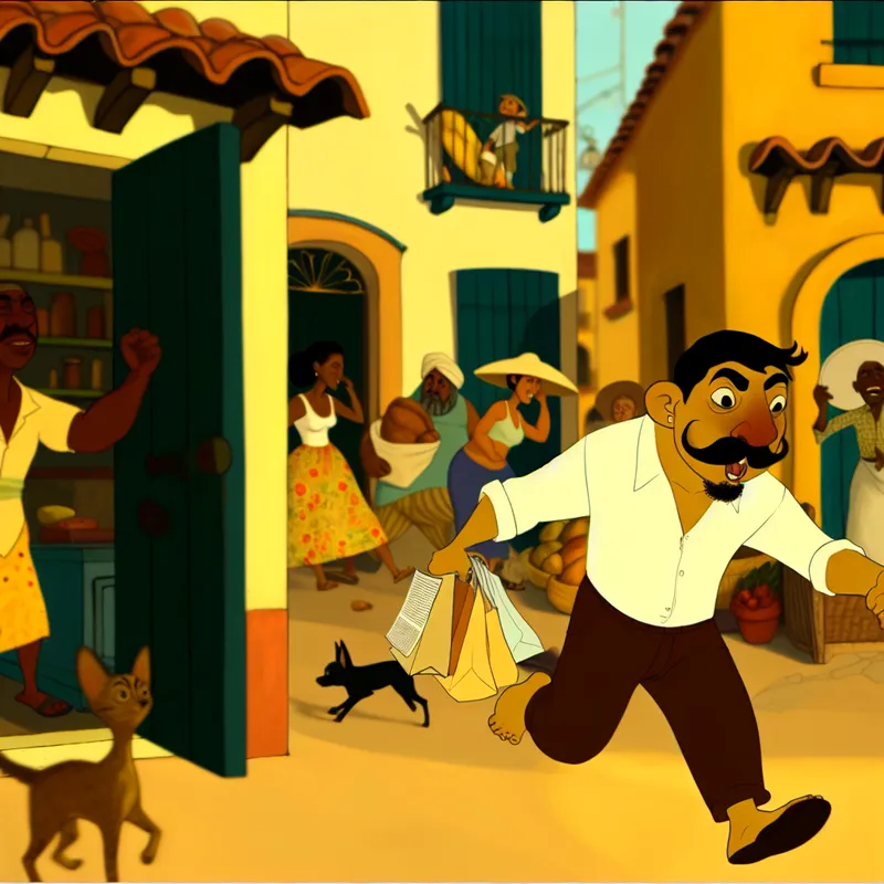Een blij persoon met boodschappen verlaat snel een huis om van de buitenlucht te genieten, met vrolijke karakters op de achtergrond.