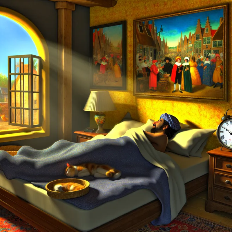 Surrealistisch tafereel van een student die lui in bed ligt op een weekendmorgen, omringd door geometrische vormen.