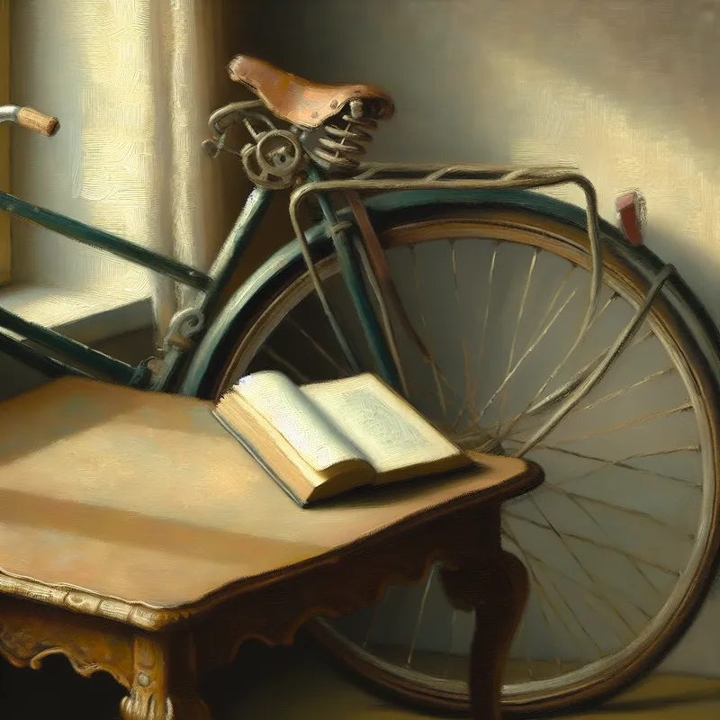 Stilleven met een houten tafel, een lichtgekleurde fiets leunend tegen de tafel en een open boek erop, in de stijl van Gerard ter Borch.