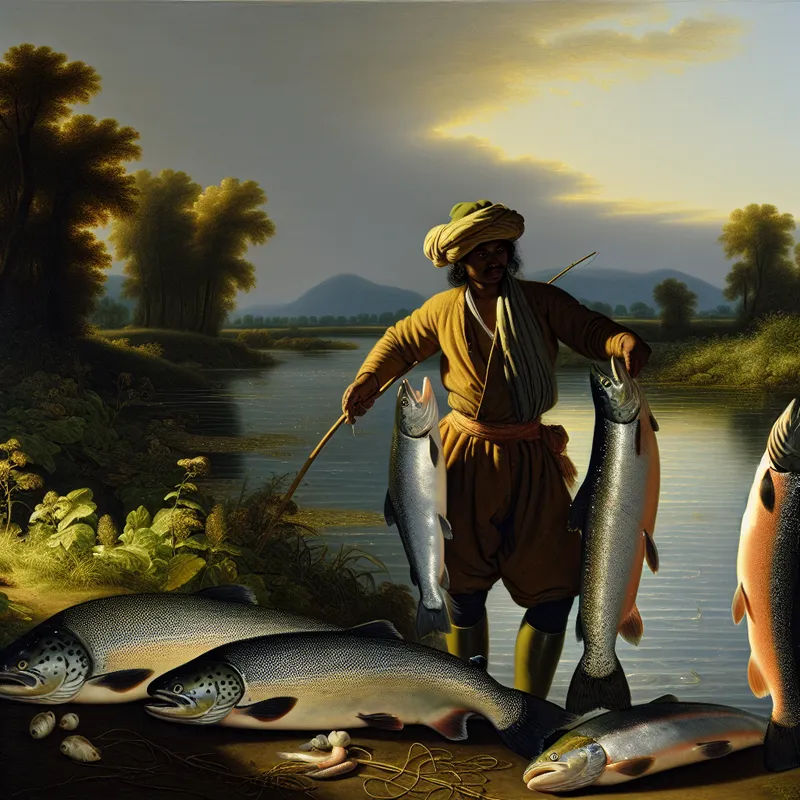 Trots visser aan de oever van een rustige rivier met grote zalm en forel in zijn handen