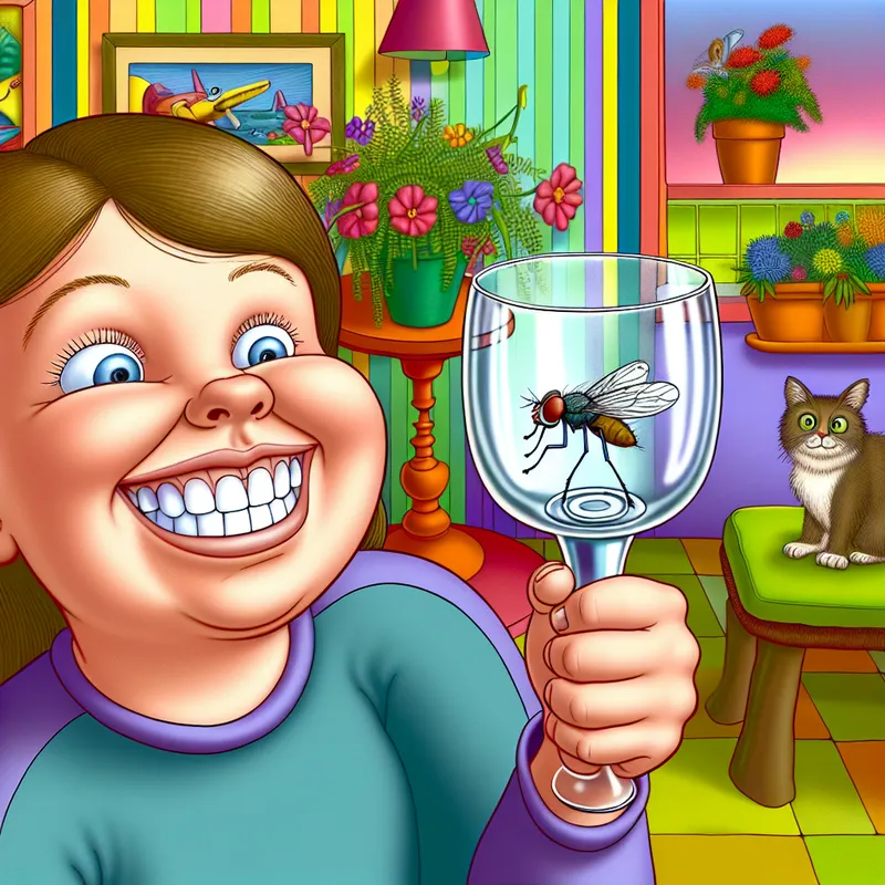 Een vrolijke cartoonachtige afbeelding van een jonge glimlachende meid die een kleine vlieg vangt met een helder glas in haar hand, terwijl een nieuwsgierige kat toekijkt.
