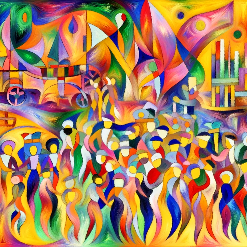 Abstracte interpretatie van een feestelijke scene met kleurrijke, speelse figuren die vreugde en opwinding uitstralen.