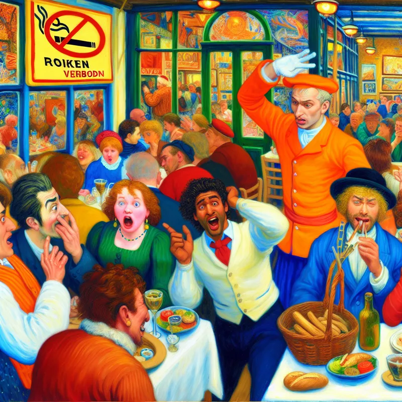 Een kleurrijke restaurantscène met een verbaasde groep eters en een ober die naar een bord met 'Roken Verboden' wijst.