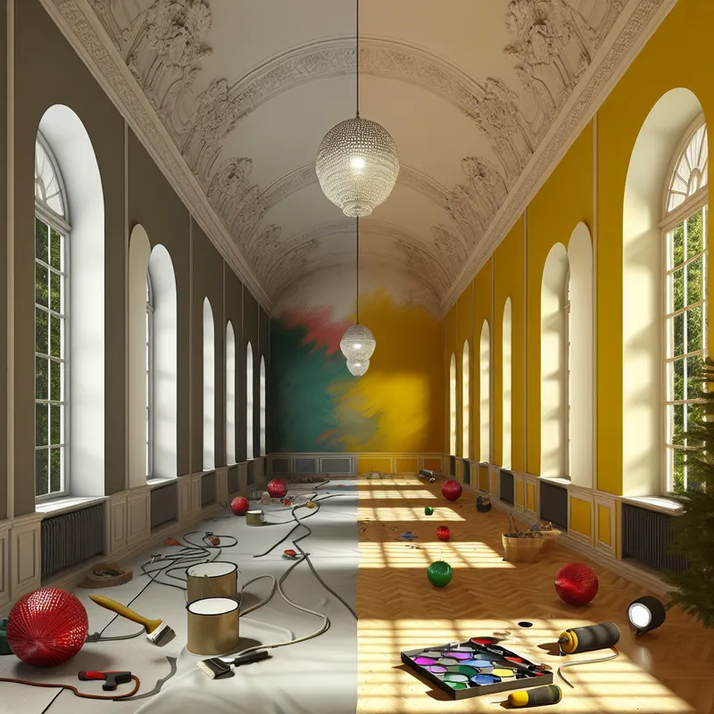 Een hyperrealistische weergave van een kamer die wordt opgeknapt en gerenoveerd met hoge plafonds en grote ramen die natuurlijk licht binnenlaten.
