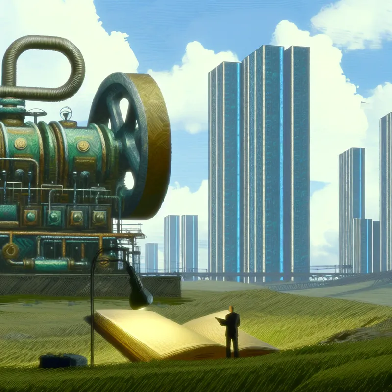 Een persoon die een complexe machine onderhoudt terwijl hij een gebruikershandleiding leest, in een hyper-realistisch industriegebied.