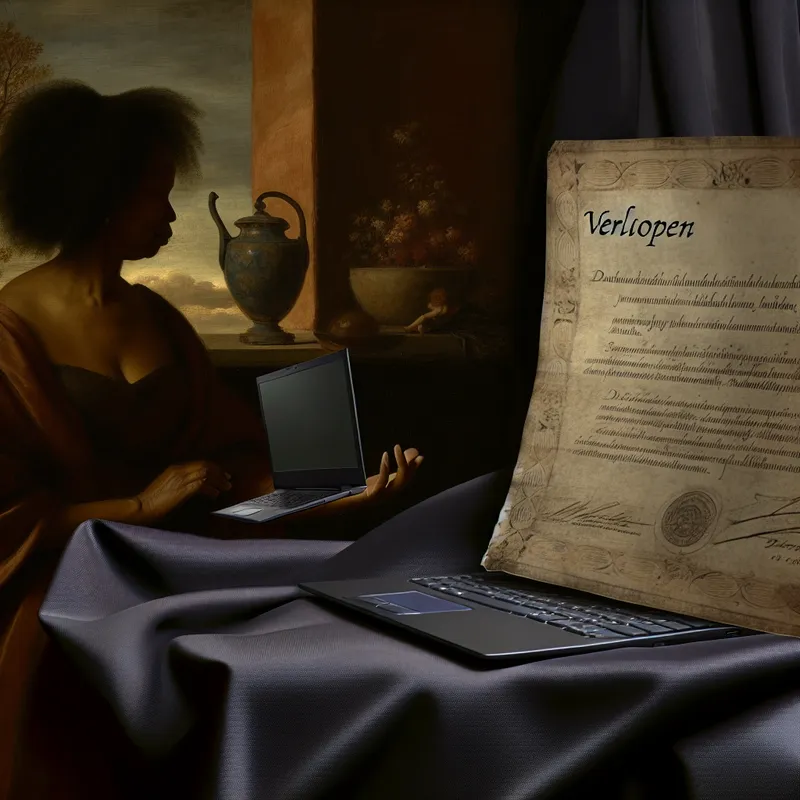 Een contemplatieve persoon met een laptop en een vervallen garantiebewijs, met het woord 'VERLOPEN' zichtbaar.