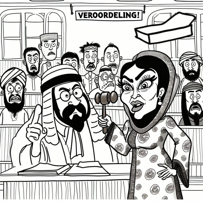 Een cartoonachtige scène in de rechtszaal met een rechter die dramatisch met een hamer slaat, en een bezorgde aanklager met een overdreven gezichtsuitdrukking.