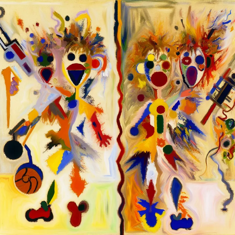 Abstract expressionistisch kunstwerk van twee broers met levendige kleuren en verschillende vormen die hun hobby's symboliseren.