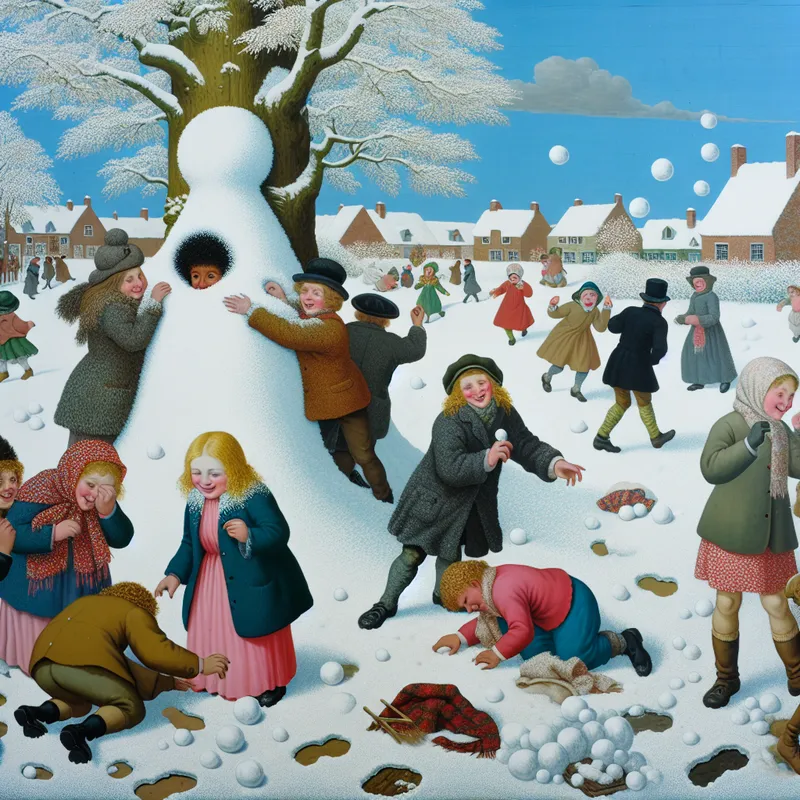 Een winterlandschap met een persoon die een grote rol met het label 'Plan' onder sneeuw verbergt terwijl anderen vrolijk schaatsen en sneeuwpoppen maken.